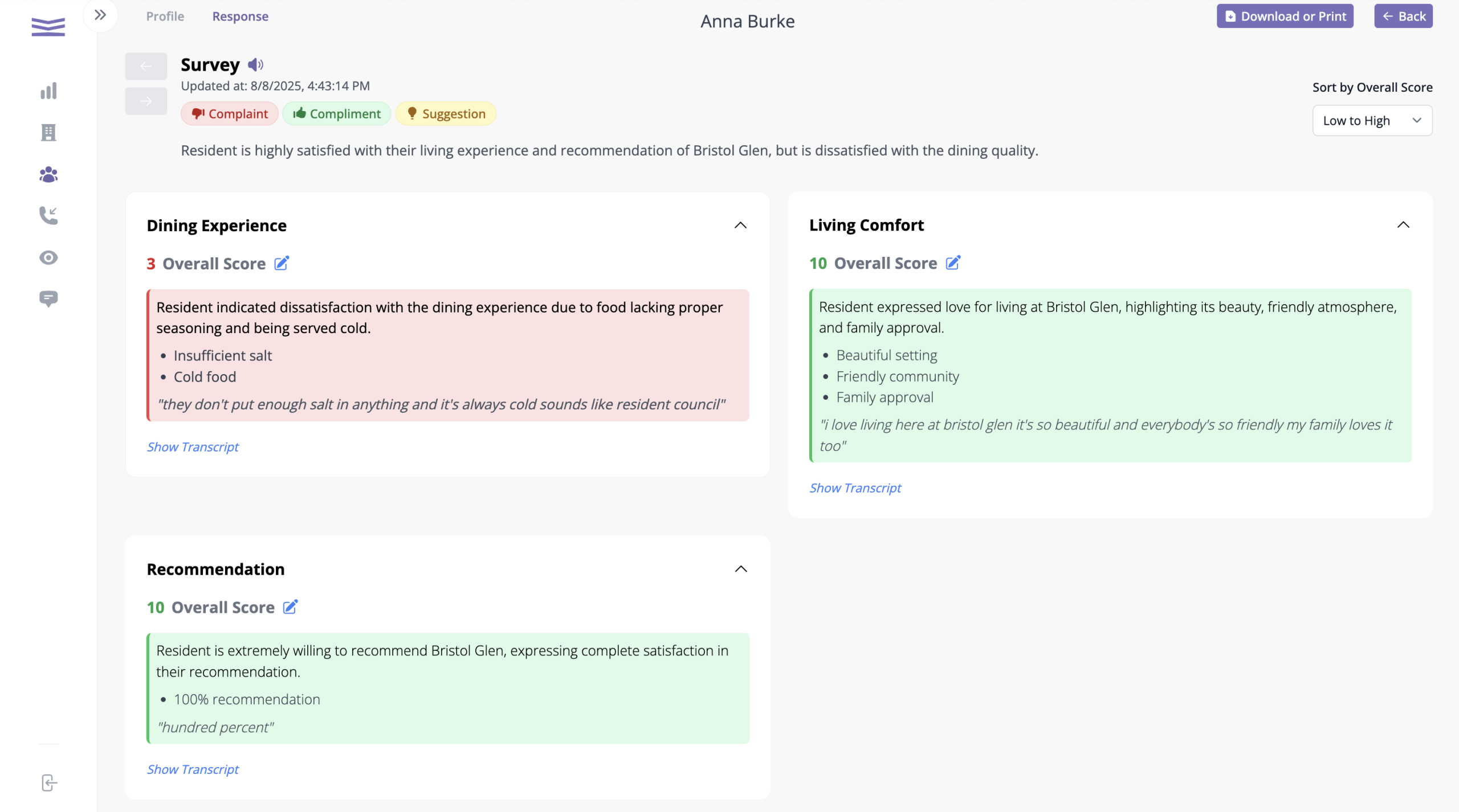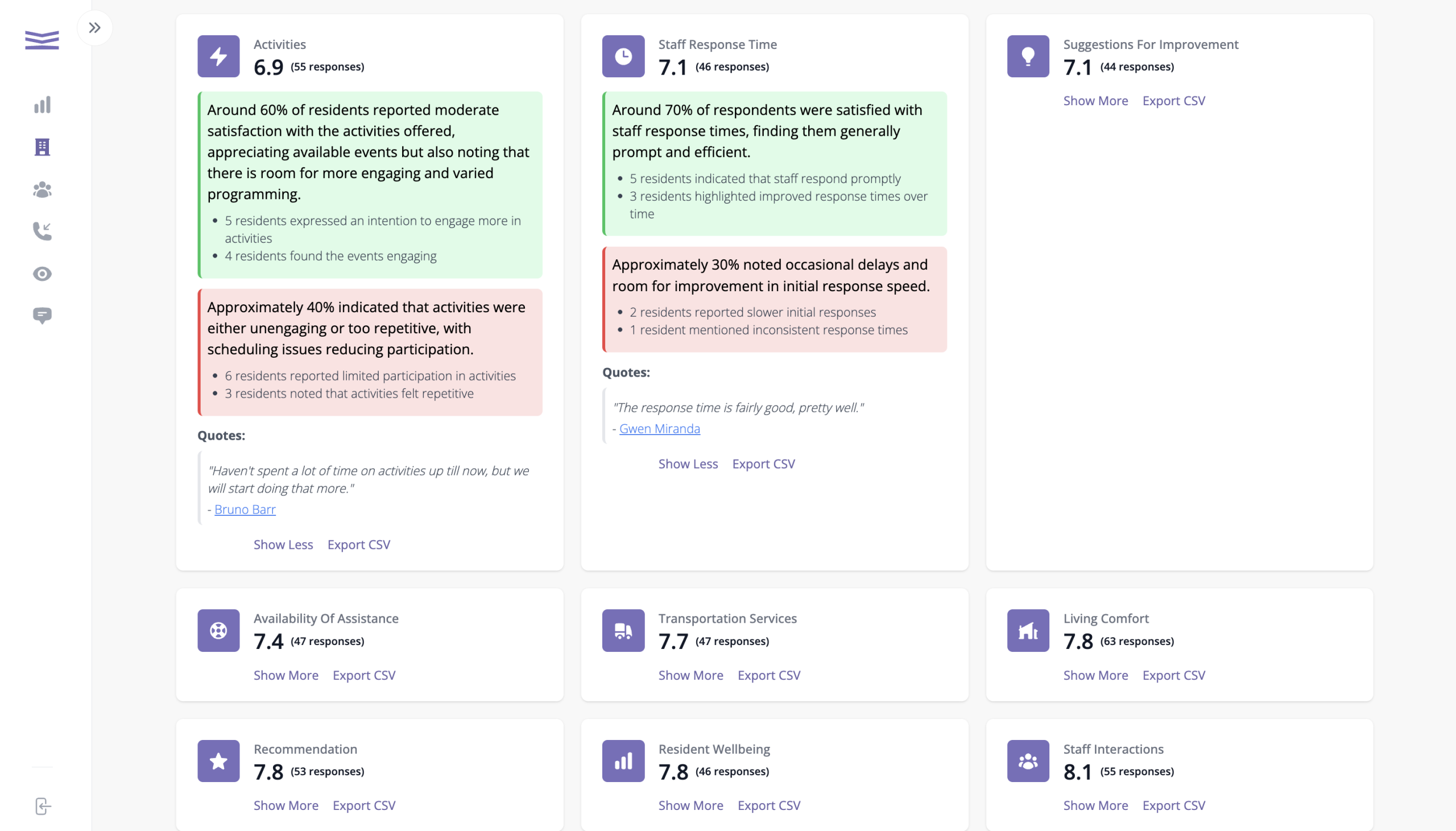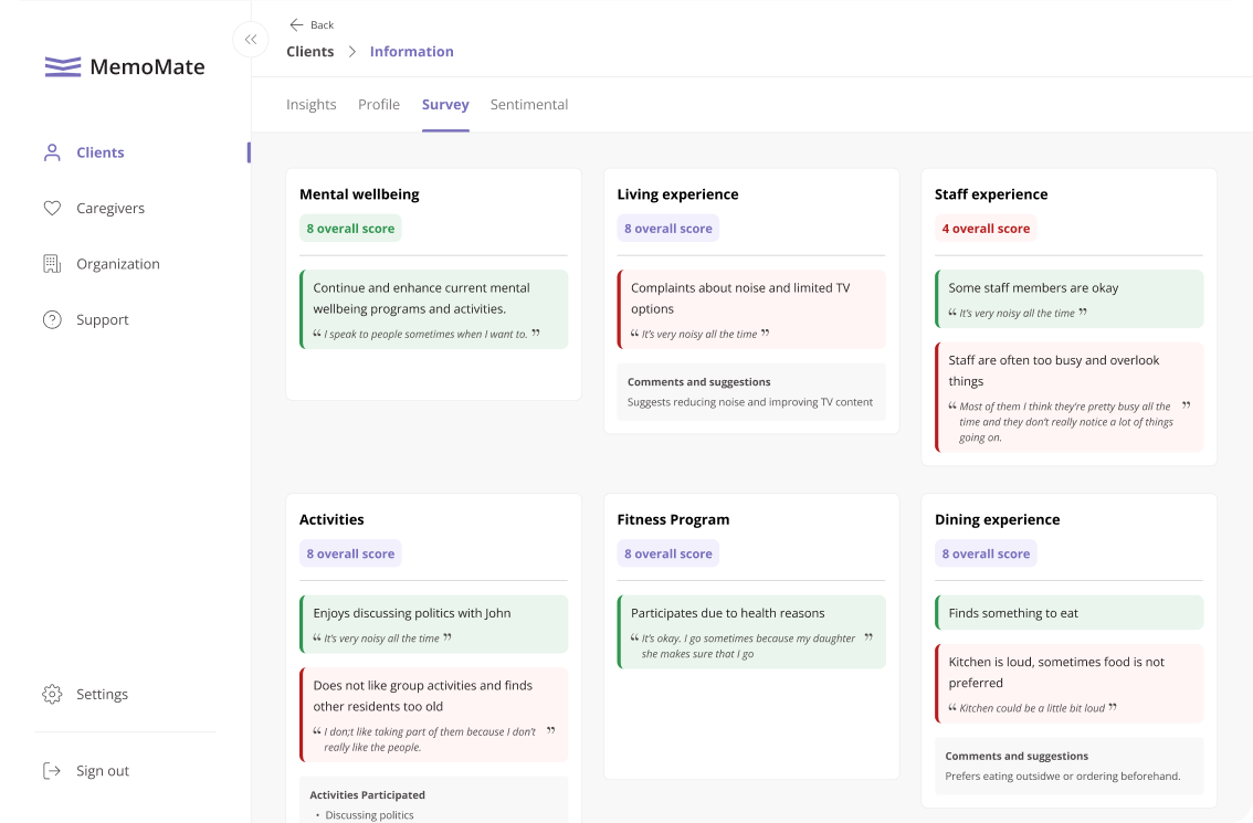 MemoMate takes a different approach. Our AI conducts frequent, natural phone conversations that capture open-ended, honest feedback in real time. Residents and families can speak in their own words — no forms, no logins, no staff involvement. From there, MemoMate automatically analyzes the responses and delivers a clear insights report, so your team can act quickly.