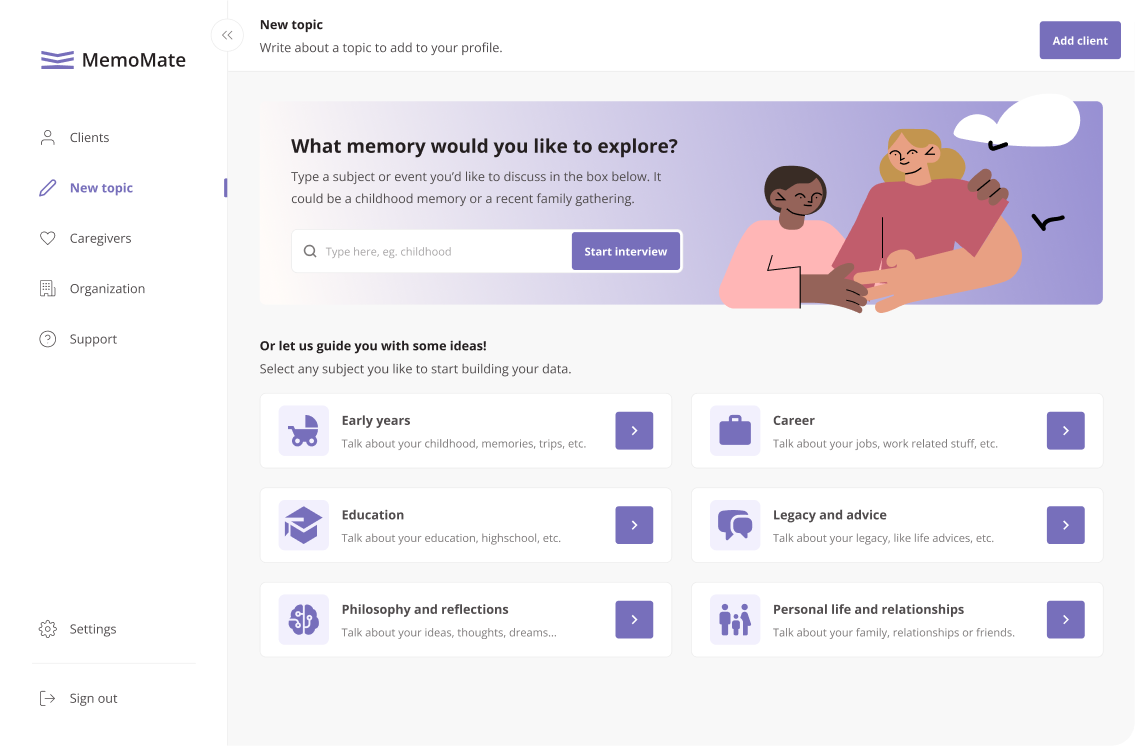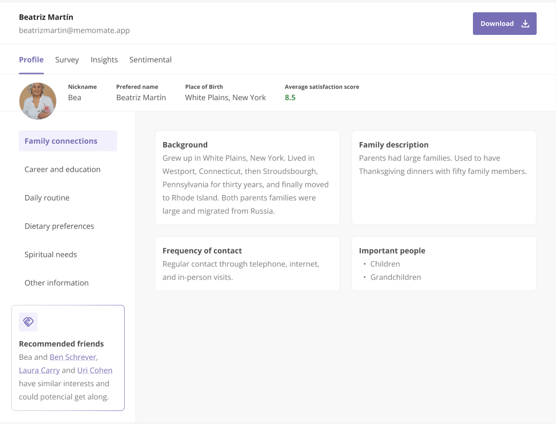 MemoMate is a voice-first AI platform that engages residents, families, staff, and job applicants through phone calls. We turn everyday conversations into actionable insights — from satisfaction surveys and admissions interviews to job interviews, life stories, and staff feedback. All insights are automatically analyzed and shared in an easy-to-use, HIPAA-compliant dashboard.