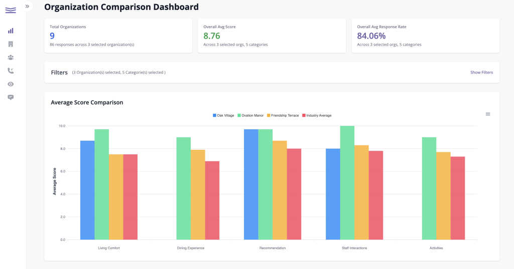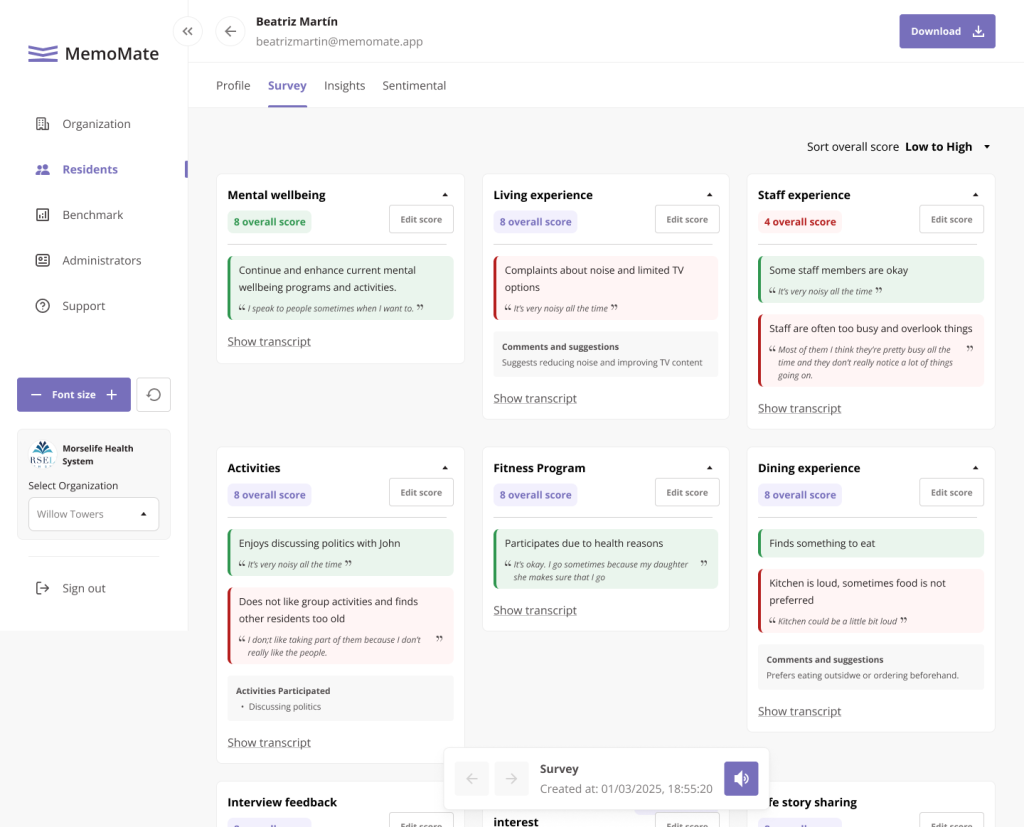 View how satisfaction changes for each resident over time. Spot early signs of disengagement or risk and personalize care with real-time insights.