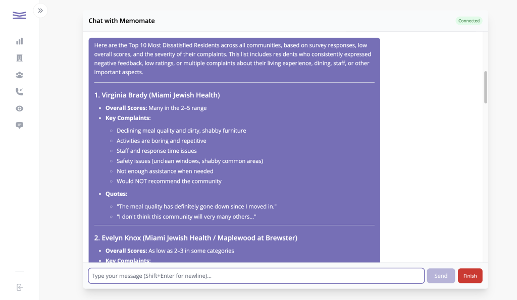 Get instant answers from resident, family, or staff surveys — no dashboards, no training. Just ask and get back quotes, scores, and insights in seconds.